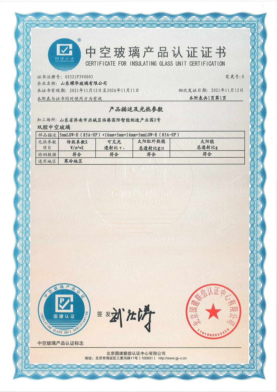被動式低能耗建筑透明部分用玻璃是目前最復雜、難度最大、質(zhì)量最高的一種中空玻璃,該產(chǎn)品性能不但要符合GB/T11944《中空玻璃》標準要求,還要滿足光熱性能指標要求,尤其對傳熱系數(shù)、太陽能總透射比和光熱比等提出了限定性指標要求。此次山東耀華公司通過“寒冷地區(qū)”雙腔中空玻璃產(chǎn)品認證,符合以下光熱參數(shù)要求: