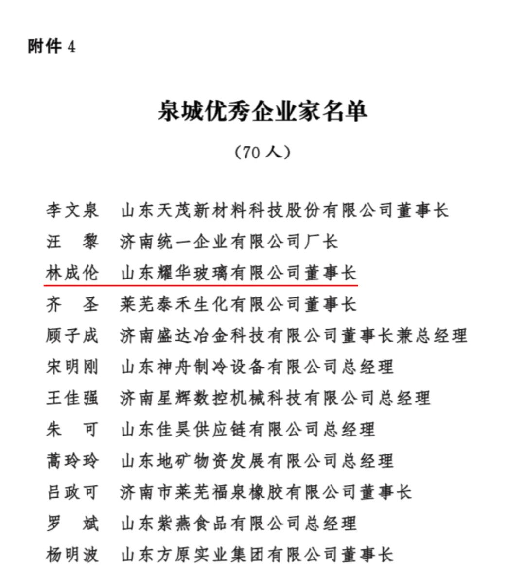 2023年7月7日,中共濟(jì)南市委、濟(jì)南市人民政府發(fā)布《關(guān)于表彰濟(jì)南市優(yōu)秀企業(yè)和優(yōu)秀企業(yè)家的決定》,山東耀華董事長(zhǎng)林成倫被授予“泉城優(yōu)秀企業(yè)家”稱號(hào)!