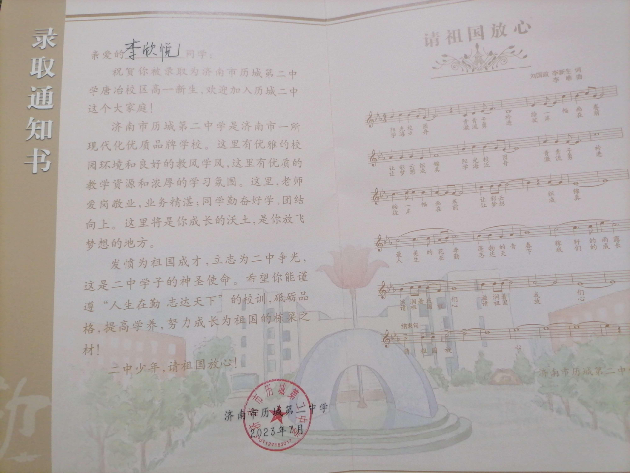 李根之女李欣悅濟南歷城二中錄取通知書