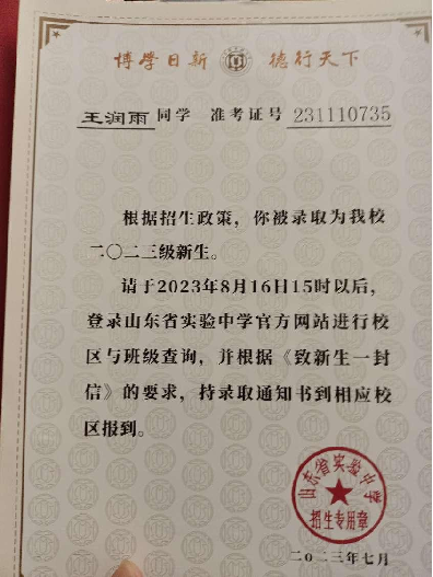 王蘭芝之女王潤雨山東省實驗中學錄取通知書