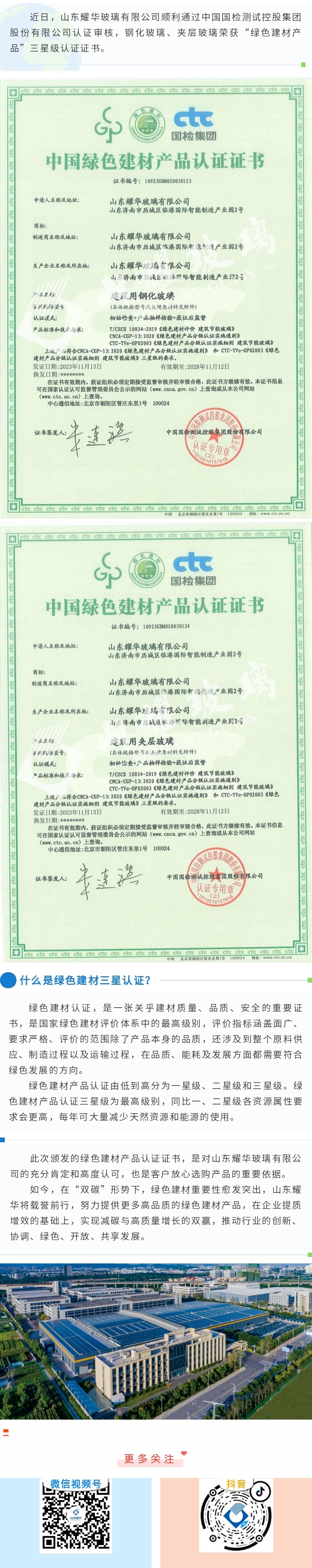 喜訊 | 山東耀華鋼化玻璃、夾層玻璃榮獲“中國綠色建材產(chǎn)品認證”三星級認證證書