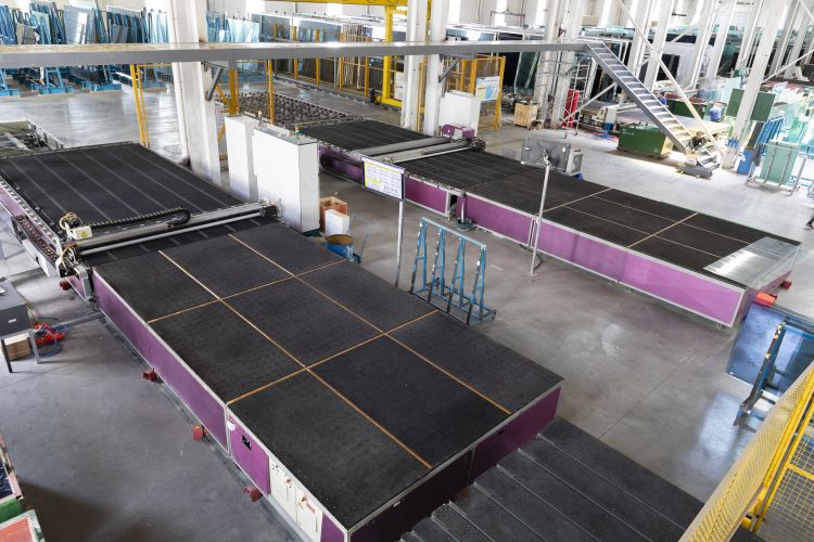 1、連線切割機:切割的玻璃經(jīng)過測量段核準尺寸后進入智能理片系統(tǒng)。